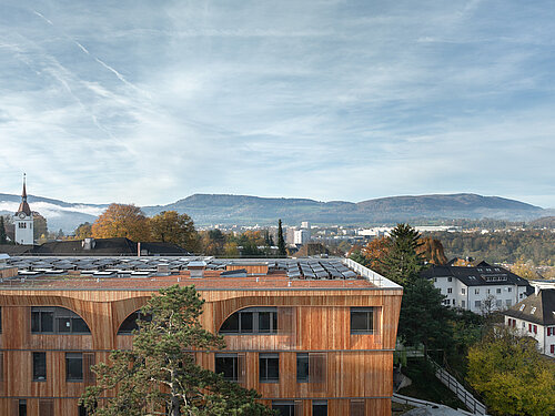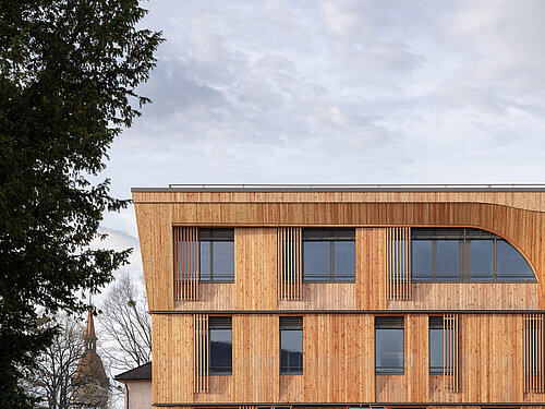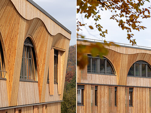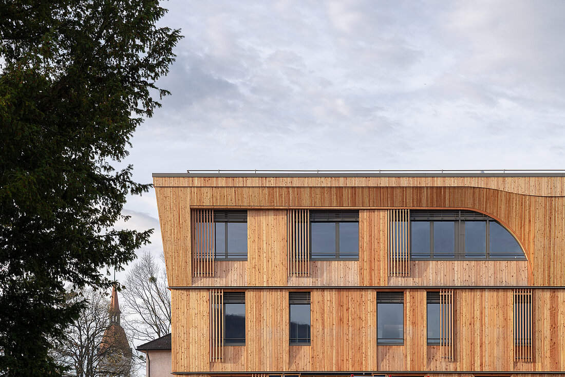 Architektur des bestehenden Hauses von Ita Wegman inspiriert und umgesetzt. Die Bogenform in der Fassade des Obergeschosses spiegelt das Motiv des „Tragens und Lastens“ wider und schafft eine harmonische Verbindung zwischen den Holzgebäuden auf dem Gelände.