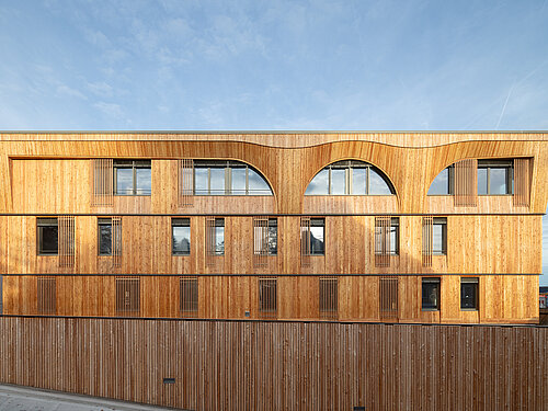 Die in der Fassade des fertiggestellten Heilmittellabors vorhandene geometrisch-flächige Bogenform verwandelt sich im Krankenhaus zu einer skulpturalen dreidimensionalen Fassade mit halbkreisförmigen Fenstern. Die sich wiederholenden Fensterformen und die Plastizität der Holzfassade lassen das Gebäude ein- und ausatmen. Entsprechend der funktionalen Bedeutung sind die Patientenzimmer in der oberen Etage als «Krone» der Klinik platziert.